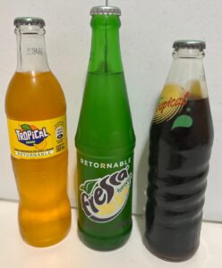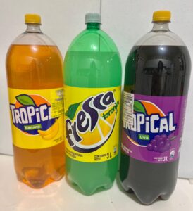 De bebidas, tenemos marcas Tropical y Fresca, con opciones de 3 litros, o en botella.